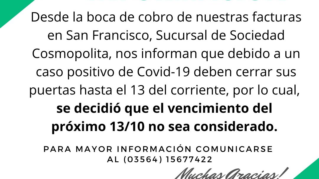 La situación del COVID-19 en la región, esta generando cambios inesperados, desde la boca de cobro en San Francisco, correspondiente a las oficinas de Sociedad Cosmopolita, nos informaron que por un resultado positivo de coronavirus entre su personal, sus oficinas estarán cerradas hasta el 13 de octubre, por lo cual,…